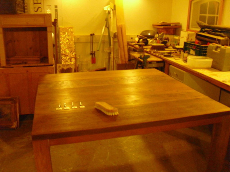 und grüner Seife gereinigt und gepflegt, und mit der Wurzelbürste von Zeit zur Zeit aufpoliert. Ich bin mal gespannt, wie der Tisch in einem halben Jahr aussieht. Den Grad des benutzt Aussehens