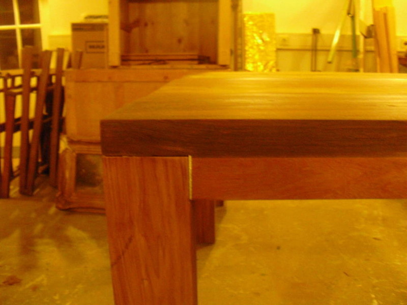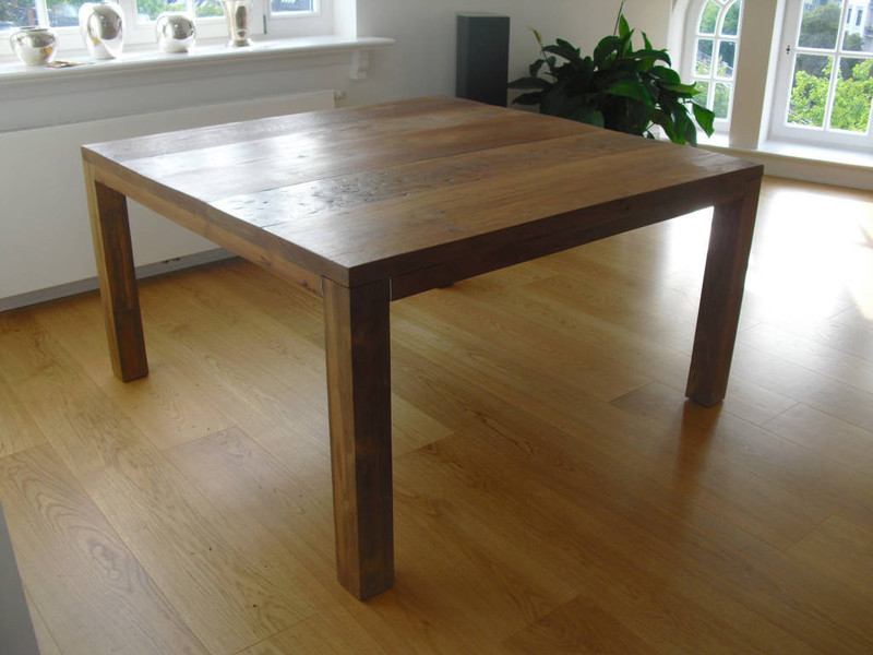 Die Vorgaben für die Abmessungen haben uns vor nicht leicht zu lösende Herausforderung gestellt. Tischplatte 140x140 cm, Stärke 4,5 cm Tischzarge ebenfalls 4,5 cm und die Beine 9x9 cm.